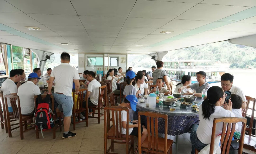 到了清远不能不游江,游江不能不到小北江。在清新县源潭镇的江口码头,一溜儿地排着大大小小的渔船供游客挑选,丰俭由人。尽管路途长达三个多小时的车程,大家还是一路高歌,只是肚子确实已经饿的呱呱叫了。第一站大家在小北江的游船上品尝当地特色菜和各式河鲜,穿梭在两岸的竹林之中,景色秀丽,别有一番风味。